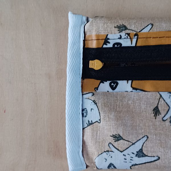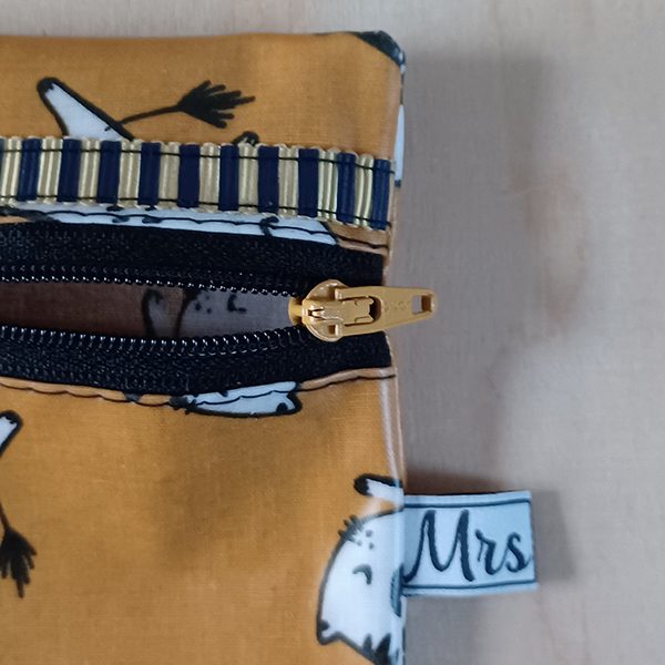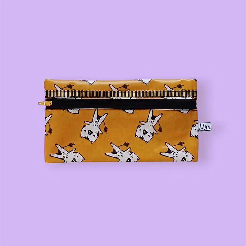 Etui Geplastificeerd Katoen Pookie is een handig pennenetui, maar is ook natuurlijk heel geschikt als etui voor losse spulletjes. Denk aan haaknaalden, make up kwasten, viltstiften en dat soort dingen. Het etui meet 21 x 11 cm en het heeft een okergele print van zwart-witte japans aandoende poezen. Het is gemaakt van katoen met een vinyl laagje erop, dat maakt het etui heel sterk. Het etui is niet gevoerd en daarom veel goedkoper dan de andere etuis en make-uptasjes op deze site. Binnenin zijn de naden afgewerkt met wit katoenen band. De zwarte ingezette rits van YKK heeft een okergele runner. Langs de rits zit een gezellig gestreept bandje.