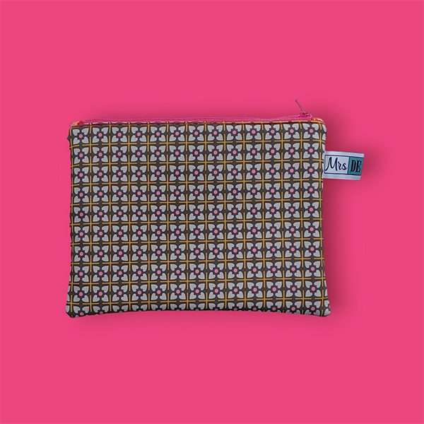 Uit alle vrolijke make-uptassen met opvallende prints koos ik er een om in mijn handtas te doen. Zo kom ik hem vaak tegen met de zachte stof, de roze retroprint, de rode binnenkant met extra vakje.